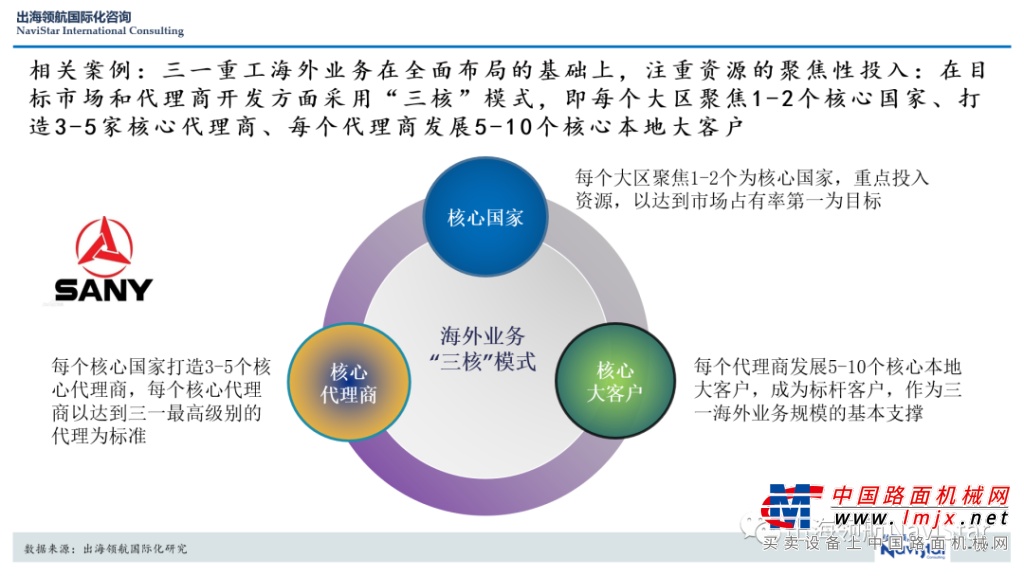 三一重工海外业务在全面布局的基础上,积极推进“三核”模式,即每个海外大区聚焦1-2个核心国家、打造3-5家核心代理商、每个代理商发展5-10个核心本地大客户。