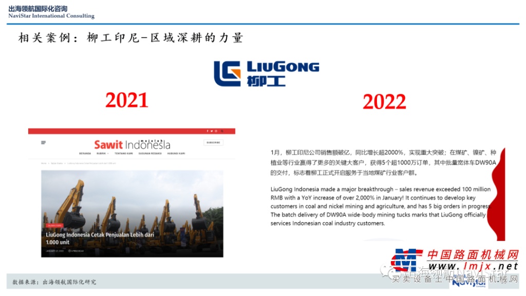 2021年广西柳工印尼市场销售突破千台,2022年1月单月销售已突破一亿人民币,就是科学选择恰当的目标市场,持续深耕、久久为功的生动写照。