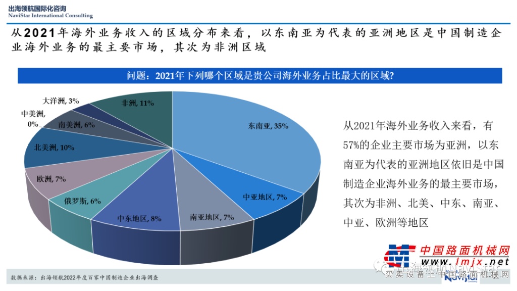 业务收入:《出海领航调查报告》显示,调研企业的2021年海外业务收入,有57%的企业主要市场为亚洲,其中,35%的企业以东南亚为最大海外业务收入来源区域;其次为非洲、北美、中东、南亚、中亚、欧洲等地区。