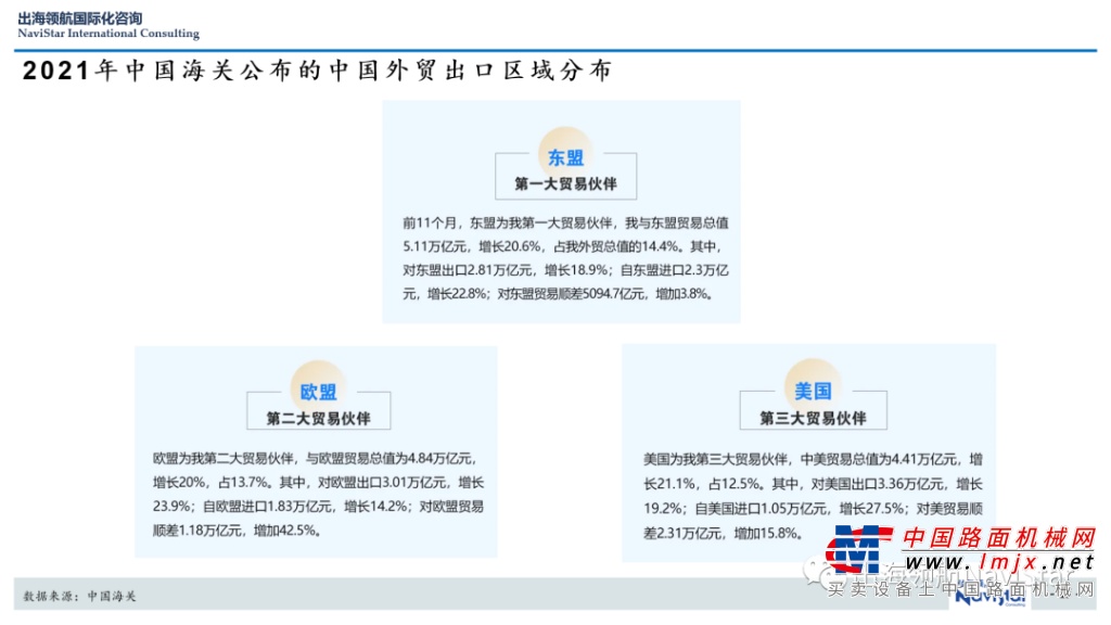 从2021年中国海关公布数据也可以看到,东盟是中国的第一大贸易伙伴,占我国外贸总额的14.4%,其次才是欧盟和美国,分别占比13.7%和12.5%。