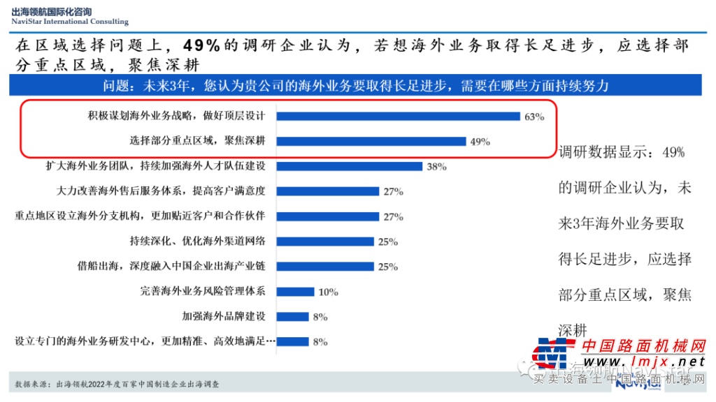 调研数据显示:在问及“未来3年,您认为贵公司的海外业务要取得长足进步,需要在哪些方面持续努力?”时,75%的企业认为应该“积极谋划海外业务战略,做好顶层设计”;49%的企业认为,应“选择部分重点区域,聚焦深耕”。