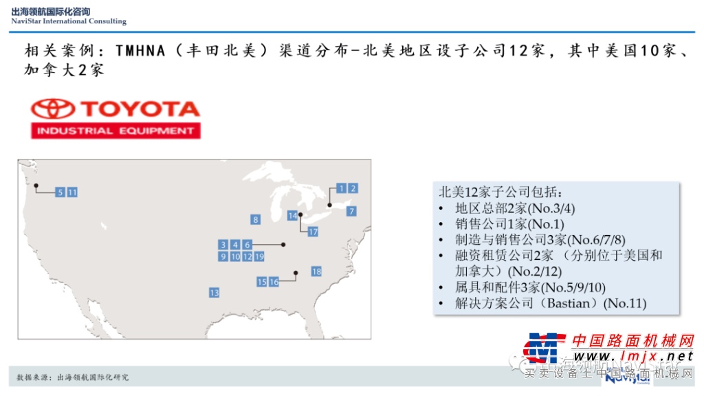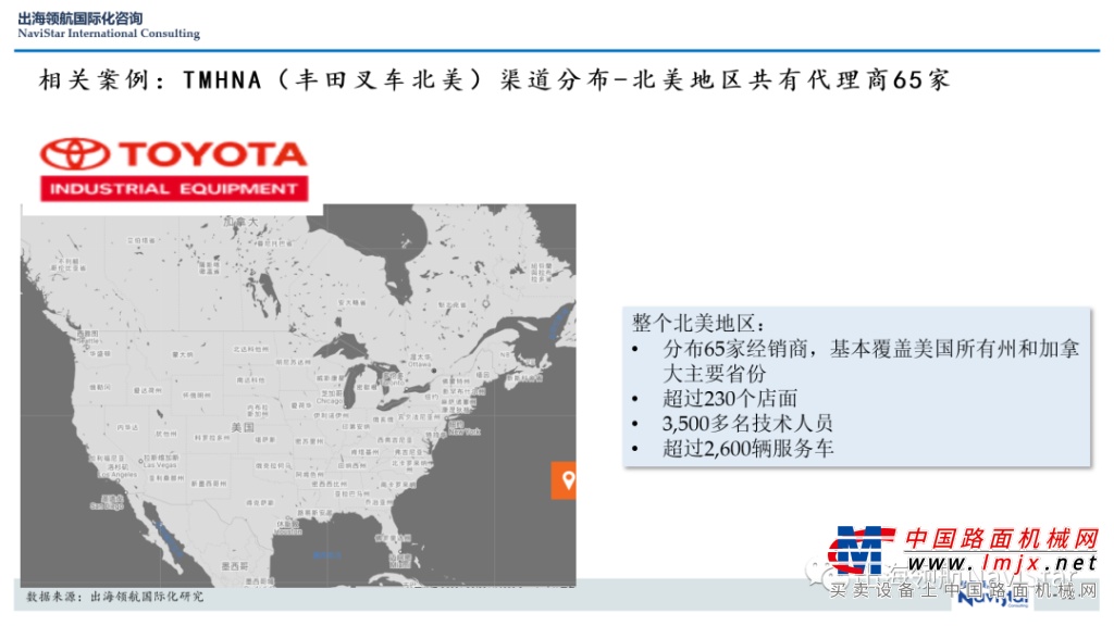 国际标杆:丰田工业集团作为全球工业车辆(叉车)当之无愧的龙头企业,“重仓”北美地区,在北美地区布局了非常密集的销售渠道,拥有代理商65家,230多个店面,2600多台服务车辆,3500多名技术人员。